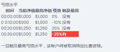 除以当前净值,若亏损超过最高亏损限制,则该账户将无法继续参赛。